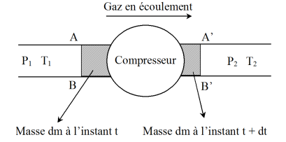 represents the work of external pressure forces in the system at the input and output of the machine (also called a work transfer).Finally, the heat transfer received by the system is zero, since, on the one hand, the compressor is heat-insulated and, secondly, there is no transfer of heat by conduction between the mass which enters or comes out of the machine and its immediate environment as temperatures are identical (and equal to
