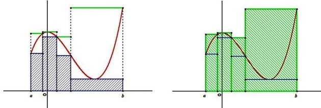 En effet, cette aire est encadrée par les aires associées aux fonctions en escalier qui minorent et qui majorent